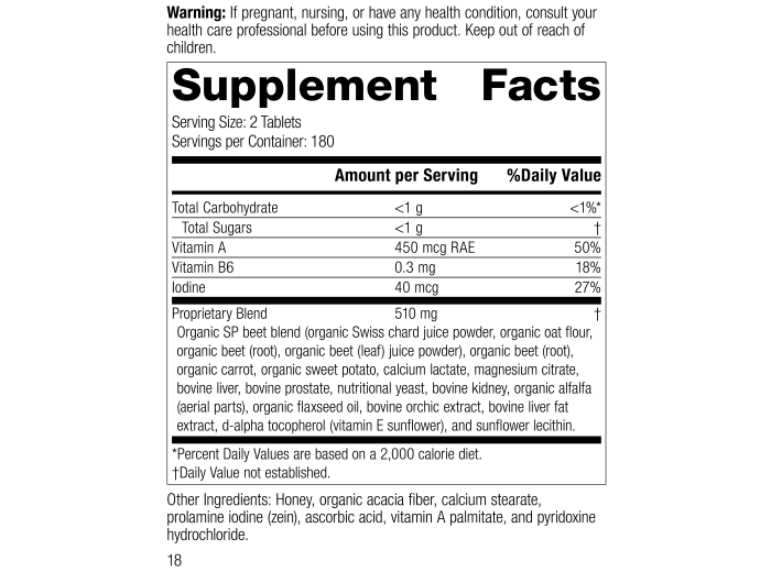 Each Serving Size (2 Tablets) contains: Total Carbohydrate <1 g, Total Sugars <1 g, Vitamin A 450 mcg RAE, Vitamin B6 0.3 mg, Iodine 40 mcg. Proprietary Blend 510 mg: Organic SP beet blend (organic Swiss chard juice powder, organic oat flour, organic beet (root), organic beet (leaf) juice powder), organic beet (root), organic carrot, organic sweet potato, calcium lactate, magnesium citrate, bovine liver, bovine prostate, nutritional yeast, bovine kidney, organic alfalfa (aerial parts), organic flaxseed oil, bovine orchic extract, bovine liver fat extract, d-alpha tocopherol (vitamin E sunflower), and sunflower lecithin. Other Ingredients: Honey, organic acacia fiber, calcium stearate, prolamine iodine (zein), ascorbic acid, vitamin A palmitate, and pyridoxine hydrochloride.