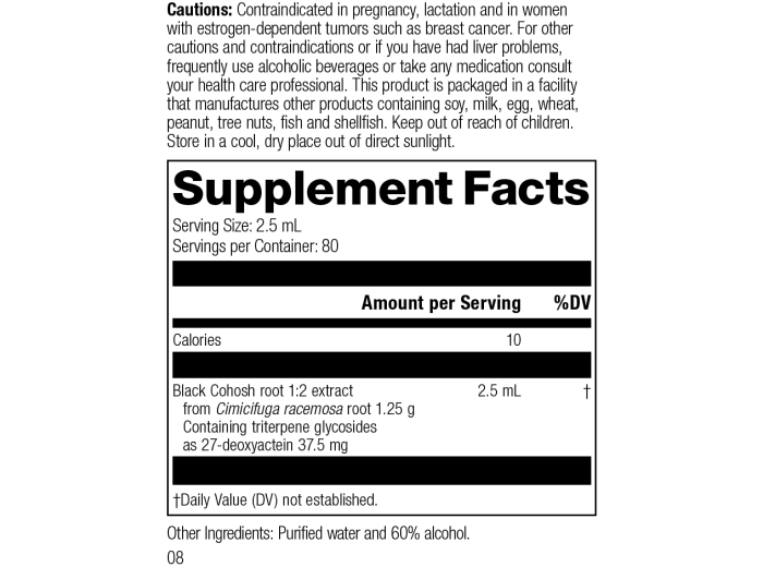 Each Serving Size 2.5 mL contains: Calories 10, Black Cohosh root 1:2 extract 2.5 mL (from Cimicifuga racemosa root 1.25 g, containing triterpene glycosides as 27-deoxyactein 37.5 mg). Other Ingredients: Purified water and 60% alcohol.