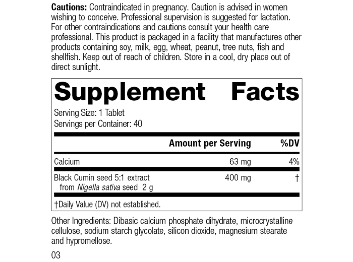 Each Serving Size (1 Tablet) contains: Calcium 63 mg, Black Cumin seed 5:1 extract 400 mg (from Nigella sativa seed 2 g).