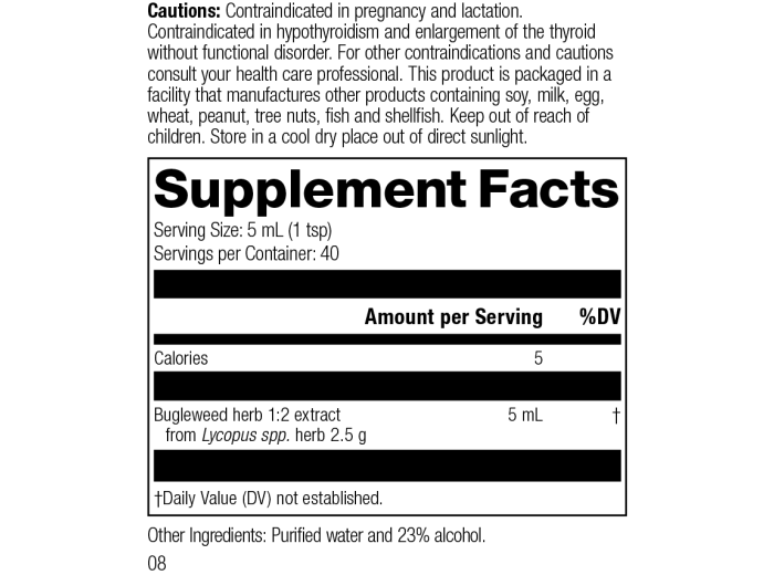 Each Serving Size 5 mL (1 tsp) contains: Calories 5, Bugleweed herb 1:2 extract 5 mL (from Lycopus spp. herb 2.5 g). Other Ingredients: Purified water and 23% alcohol.