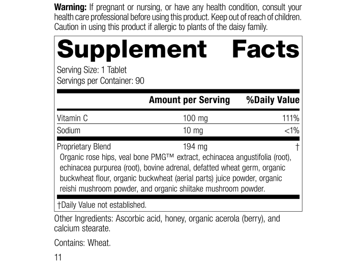 Each Serving Size (1 tablet) contains: Vitamin C 100 mg, Sodium 10 mg. Proprietary Blend 194 mg: Organic rose hips, veal bone PMG™ extract, echinacea angustifolia (root), echinacea purpurea (root), bovine adrenal, defatted wheat germ, organic buckwheat flour, organic buckwheat (aerial parts) juice powder, organic reishi mushroom powder, and organic shiitake mushroom powder. Other Ingredients: Ascorbic acid, honey, organic acerola (berry), and calcium stearate. Contains: Wheat.