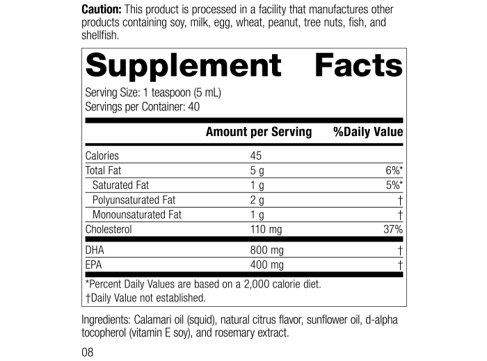 Each Serving Size (1 Teaspoon (5 mL)) contains: Calories 45, Total Fat 5 g, Saturated Fat 1 g, Polyunsaturated Fat 2 g, Monosaturated Fat 1 g, Cholesterol 110 mg, DHA 800 mg, EPA 400 mg. Ingredients: Calamari oil (squid), natural citrus flavor, sunflower oil, d-alpha tocopherol (vitamin E soy), and rosemary extract.
