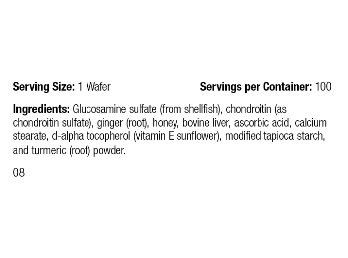 Each Serving Size (1 wafer) contains: Ingredients: Glucosamine sulfate (from shellfish), chondroitin (as chondroitin sulfate), ginger (root), honey, bovine liver, ascorbic acid, calcium stearate, d-alpha tocopherol (vitamin E sunflower), modified tapioca starch, and turmeric (root) powder.