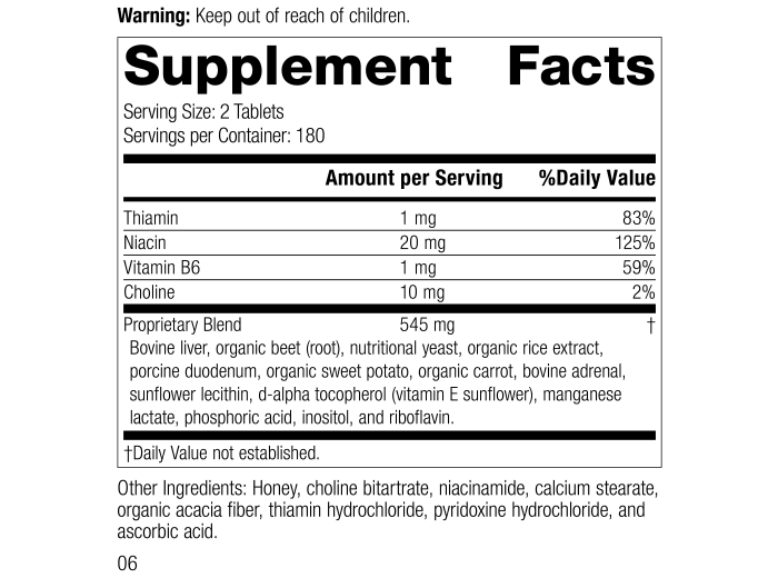 Nutrients & Ingredients – Each Serving Size (2 Tablets) contains: Thiamin 1 mg, Niacin 20 mg, Vitamin B6 1 mg, Choline 10 mg. Proprietary Blend 545 mg: Bovine liver, organic beet (root), nutritional yeast, organic rice extract, porcine duodenum, organic sweet potato, organic carrot, bovine adrenal, sunflower lecithin, d-alpha tocopherol (vitamin E sunflower), manganese lactate, phosphoric acid, inositol, and riboflavin. Other Ingredients: Honey, choline bitartrate, niacinamide, calcium stearate, organic acacia fiber, thiamin hydrochloride, pyridoxine hydrochloride, and ascorbic acid.