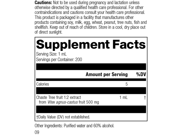Each Serving Size 1 mL contains: Calories 5, Chaste Tree fruit 1:2 extract 1 mL (from Vitex agnus-castus fruit 500 mg). Other Ingredients: Purified water and 60% alcohol.