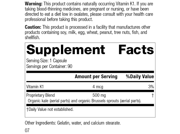 Each Serving Size (1 Capsule) contains: Vitamin K1 4 mcg. Proprietary Blend 500 mg: Organic kale (aerial parts) and organic Brussels sprouts (aerial parts). Other Ingredients: Gelatin, water, and calcium stearate.