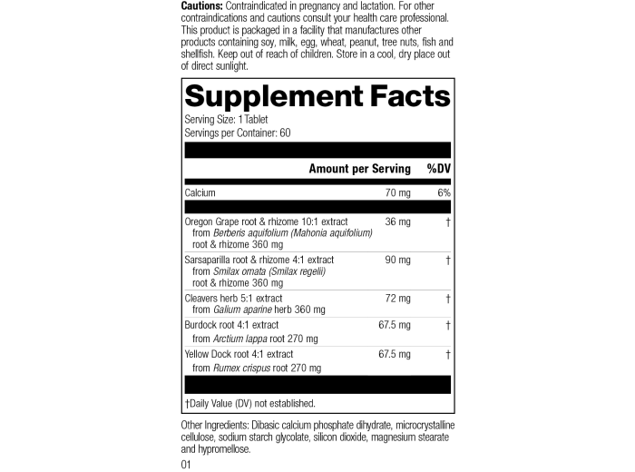 Each Serving Size (1 Tablet) contains: Calcium 70 mg, Oregon Grape root & rhizome 10:1 extract 36 mg (from Berberis aquifolium (Mahonia aquifolium) root & rhizome 360 mg), Sarsaparilla root & rhizome 4:1 extract 90 mg (from Smilax ornata (Smilax regelii) root & rhizome 360 mg), Cleavers herb 5:1 extract 72 mg (from Galium aparine herb 360 mg), Burdock root 4:1 extract 67.5 mg (from Arctium lappa root 270 mg), Yellow Dock root 4:1 extract 67.5 mg (from Rumex crispus root 270 mg). Other Ingredients: Dibasic calcium phosphate dihydrate, microcrystalline cellulose, sodium starch glycolate, silicon dioxide, magnesium stearate and hypromellose.