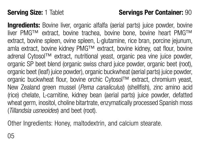 Each Serving Size (1 Tablet) contains: Ingredients: Bovine liver, organic alfalfa (aerial parts) juice powder, bovine liver PMGTM extract, bovine trachea, bovine bone, bovine heart PMGTM extract, bovine spleen, ovine spleen, L-glutamine, rice bran, porcine jejunum, amla extract, bovine kidney PMGTM extract, bovine kidney, oat flour, bovine adrenal CytosolTM extract, nutritional yeast, organic pea vine juice powder, organic SP beet blend (organic swiss chard juice powder, organic beet (root), organic beet (leaf) juice powder), organic buckwheat (aerial parts) juice powder, organic buckwheat flour, bovine orchic CytosolTM extract, chromium yeast, New Zealand green mussel (Perna canaliculus) (shellfish), zinc amino acid (rice) chelate, L-carnitine, kidney bean (aerial parts) juice powder, defatted wheat germ, inositol, choline bitartrate, enzymatically processed Spanish moss (Tillandsia usneoides) and beet (root). Other Ingredients: Honey, maltodextrin, and calcium stearate.