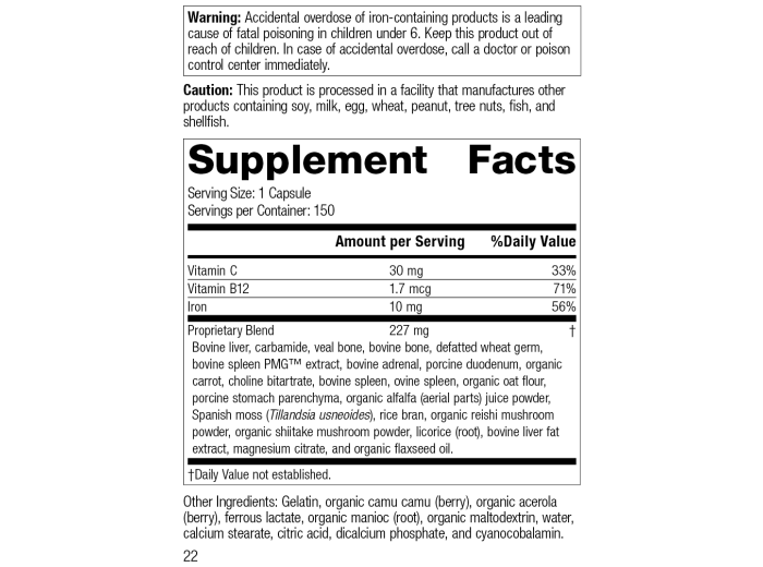 Each Serving Size (1 Capsule) contains: Vitamin C 30 mg, Vitamin B12 1.7 mcg, Iron 10 mg. Proprietary Blend 227 mg: Bovine liver, carbamide, veal bone, bovine bone, defatted wheat germ, bovine spleen PMG™ extract, bovine adrenal, porcine duodenum, organic carrot, choline bitartrate, bovine spleen, ovine spleen, organic oat flour, porcine stomach parenchyma, organic alfalfa (aerial parts) juice powder, Spanish moss (Tillandsia usneoides), rice bran, organic reishi mushroom powder, organic shiitake mushroom powder, licorice (root), bovine liver fat extract, magnesium citrate, and organic flaxseed oil. Other Ingredients: Gelatin, organic camu camu (berry), organic acerola (berry), ferrous lactate, organic manioc (root), organic maltodextrin, water, calcium stearate, citric acid, dicalcium phosphate, and cyanocobalamin.