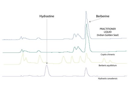 The substituted herbs usually contain the substance berberine which provides the yellow color, but they do not contain hydrastine which is unique to Golden Seal. Only HPLC enables this differentiation to be made. MediHerb only buys cultivated Golden Seal to ensure long term sustainability of the herb. MediHerb tests each batch of Golden Seal raw material and finished product to ensure the claimed levels of hydrastine and berberine are present. Using HPLC, MediHerb is able to clearly differentiate true Golden Seal from other berberine-containing herbs. The table demonstrates the difference between the various berberine-containing species. The top trace is an example of substitution where a professional product being sold in Australia as Indian Golden Seal matched the trace of Coptis chinensis.