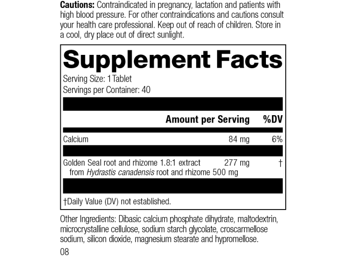 Each Serving Size (1 Tablet) contains: Calcium 84 mg, Golden Seal root & rhizome 1.8:1 extract 277 mg (from Hydrastis canadensis root and rhizome 500 mg). Other Ingredients: Dibasic calcium phosphate dihydrate, maltodextrin, microcrystalline cellulose, sodium starch glycolate, croscarmellose sodium, silicon dioxide, magnesium stearate and hypromellose.