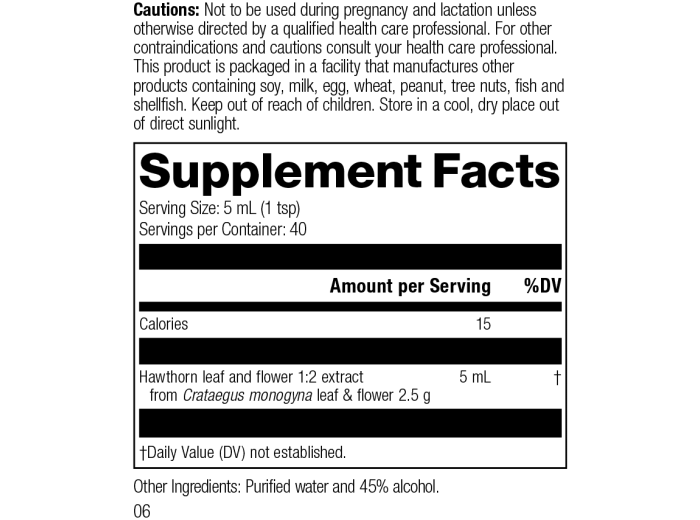 Each Serving Size 5 mL (1 tsp) contains: Calories 15, Hawthorn leaf and flower 1:2 extract 5 mL (from Crataegus monogyna leaf & flower 2.5 g). Other Ingredients: Purified water and 45% alcohol.
