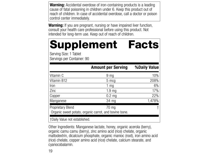 Each Serving Size (1 Tablet) contains: Vitamin C 9 mg, Vitamin B12 5 mcg, Iron 1 mg, Zinc 1.9 mg, Copper 0.2 mg, Manganese 34 mg. Proprietary Blend 70 mg: Organic sweet potato, organic carrot, and bovine bone. Other Ingredients: Manganese lactate, honey, organic acerola (berry), organic camu camu (berry), zinc amino acid (rice) chelate, organic maltodextrin, dicalcium phosphate, organic manioc (root), iron amino acid (rice) chelate, copper amino acid (rice) chelate, calcium stearate, and cyanocobalamin.