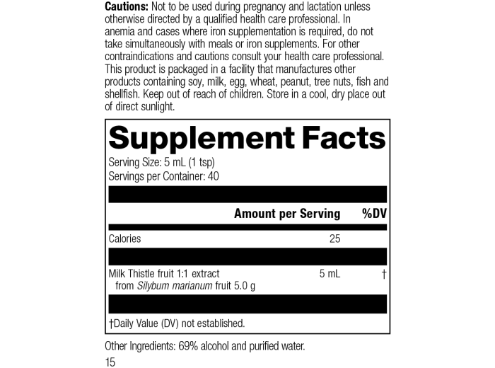 Each Serving Size 5 mL (1 tsp) contains: Calories 25, Milk Thistle fruit 1:1 extract 5 mL (from Silybum marianum fruit 5.0 g). Other Ingredients: 69% alcohol and purified water.