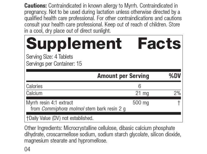 Each Serving Size (4 Tablets) contains: 6 Calories, Calcium 21 mg, Myrrh resin 4:1 extract 500 mg (from Commiphora molmol stem bark resin 2 g). Other Ingredients: Microcrystalline cellulose, dibasic calcium phosphate dihydrate, croscarmellose sodium, sodium starch glycolate, silicon dioxide, magnesium stearate and hypromellose.