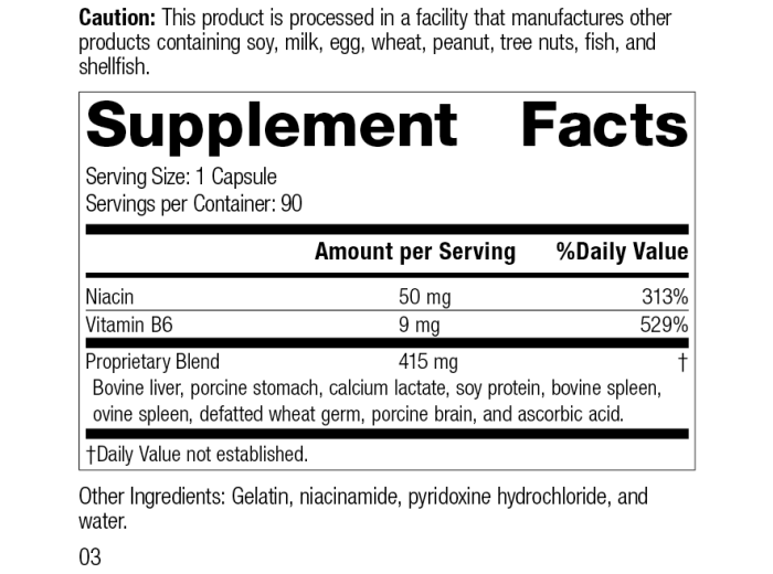 Each Serving Size (1 Capsule) contains: Niacin 50 mg, Vitamin B6 9 mg. Proprietary Blend 415 mg: Bovine liver, porcine stomach, calcium lactate, soy protein, bovine spleen, ovine spleen, defatted wheat germ, porcine brain, and ascorbic acid. Other Ingredients: Gelatin, niacinamide, pyridoxine hydrochloride, and water.