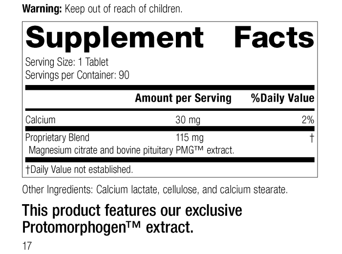 Each Serving Size (1 tablet) contains: Calcium 30 mg. Proprietary Blend 115 mg: Magnesium citrate and bovine pituitary PMG™ extract. Other Ingredients: Calcium lactate, cellulose, and calcium stearate.