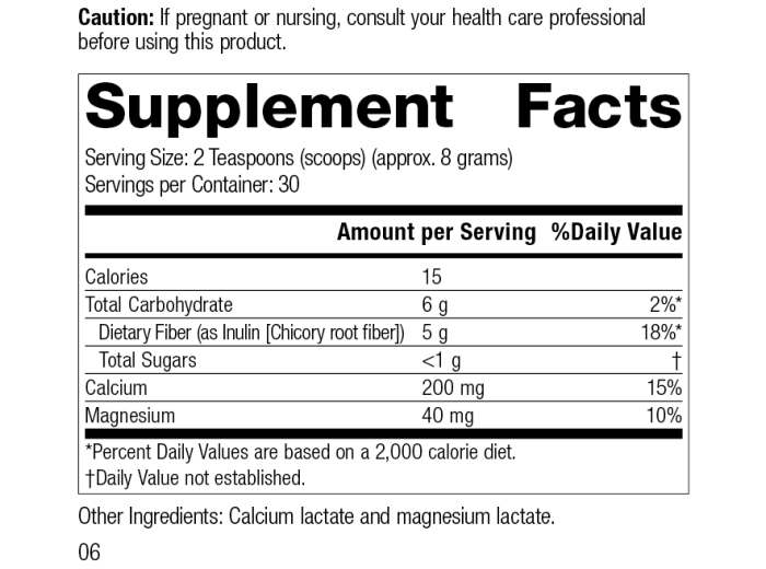 Each Serving Size (2 Teaspoons) contains: Calories 15, Total Carbohydrate 6 g, Dietary Fiber (as Inulin [Chicory root fiber]) 5 g, Total Sugars <1 g, Calcium 200 mg, Magnesium 40 mg. Other Ingredients: Calcium lactate and magnesium lactate.