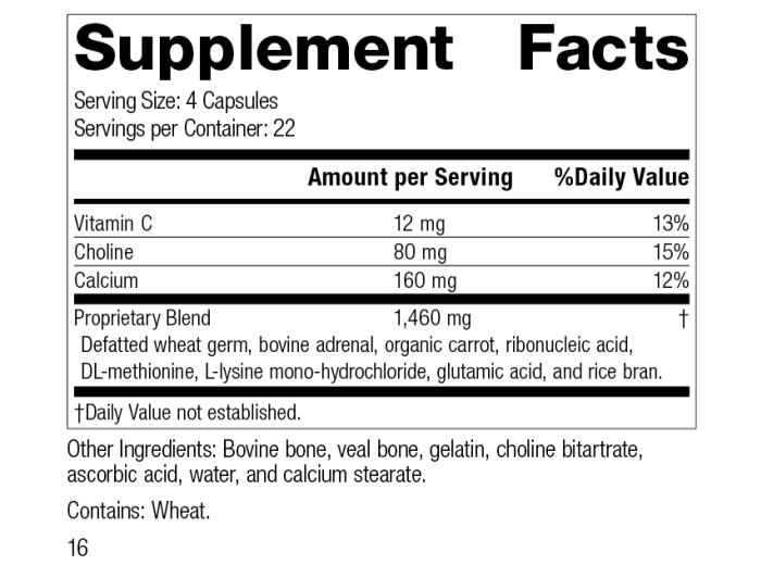 Each Serving Size (4 Capsules) contains: Vitamin C 12 mg, Choline 80 mg, Calcium 160 mg. Proprietary Blend 1460 mg: Defatted wheat germ, bovine adrenal, organic carrot, ribonucleic acid, DL-methionine, L-lysine mono-hydrochloride, glutamic acid, and rice bran. Other Ingredients: Bovine bone, veal bone, gelatin, choline bitartrate, ascorbic acid, water, and calcium stearate. Contains: Wheat
