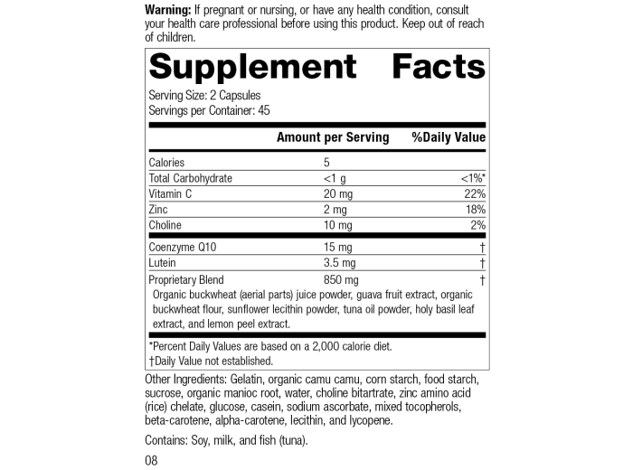 Each Serving Size (2 Capsules) contains: Calories 5, Total Carbohydrate <1 g, Vitamin C 20 mg, Zinc 2 mg, Choline 10 mg, Coenzyme Q10 15 mg, Lutein 3.5 mg. Proprietary Blend 850 mg: Organic buckwheat (aerial parts) juice powder, guava fruit extract, organic buckwheat flour, sunflower lecithin powder, tuna oil powder, holy basil leaf extract, and lemon peel extract. Other Ingredients: Gelatin, organic camu camu, corn starch, food starch, sucrose, organic manioc root, water, choline bitartrate, zinc amino acid (rice) chelate, glucose, casein, sodium ascorbate, mixed tocopherols, beta-carotene, alpha-carotene, lecithin, and lycopene. Contains: Soy, milk, and fish (tuna).