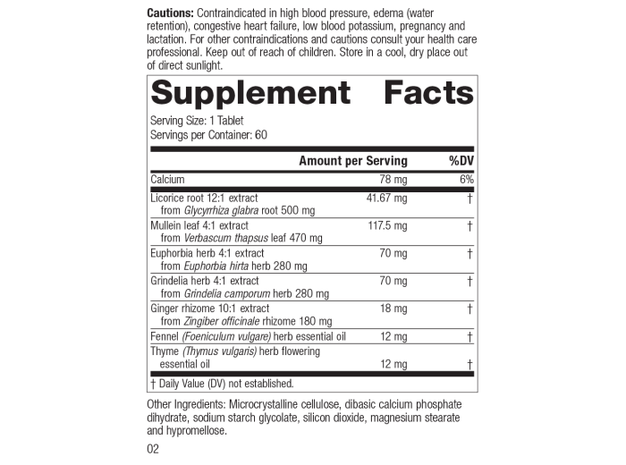 Each Serving Size (1 Tablet) contains: Calcium 78 mg, Licorice root 12:1 extract 41.67 mg (from Glycyrrhiza glabra root 500 mg), Mullein leaf 4:1 extract 117.5 mg (from Verbascum thapsus leaf 470 mg), Euphorbia herb 4:1 extract 70 mg (from Euphorbia hirta herb 280 mg), Grindelia herb 4:1 extract 70 mg (from Grindelia camporum herb 280 mg), Ginger rhizome 10:1 extract 18 mg (from Zingiber officinale rhizome 180 mg), Fennel (Foeniculum vulgare) herb essential oil 12 mg, Thyme (Thymus vulgaris) herb flowering essential oil 12 mg. Other Ingredients: Microcrystalline cellulose, dibasic calcium phosphate dihydrate, sodium starch glycolate, silicon dioxide, magnesium stearate and hypromellose.
