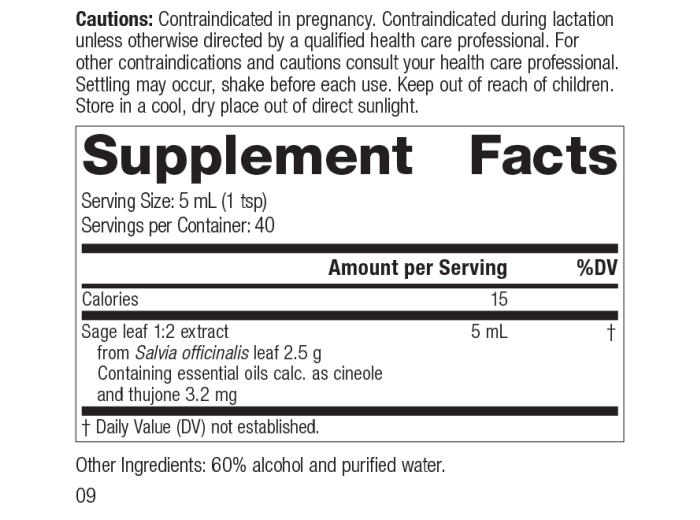 Each Serving Size (5 mL (1 tsp)) contains: Calories 15, Sage leaf 1:2 extract 5 mL (from Salvia officinalis leaf 2.5 g, Containing essential oils calc. as cineole and thujone 3.2 mg). Other Ingredients: 60% alcohol and purified water.