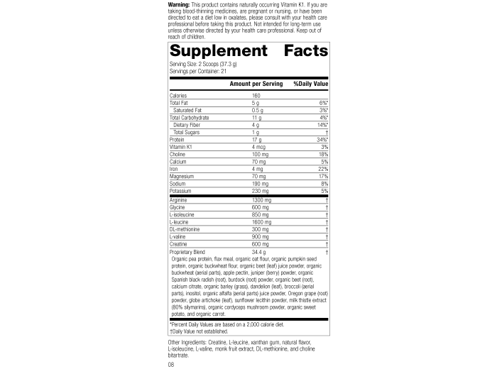 Each Serving Size (2 Scoops) contains: Calories 160, Total Fat 5 g, Saturated Fat 0.5 g, Total carbohydrate 11 g, Dietary Fiber 4 g, Total Sugars 1 g, Protein 17 g , Vitamin K1 4 mcg , Choline 100 mg , Calcium 70 mg , Iron 4 mg , Magnesium 70 mg , Sodium 190 mg , Potassium 230 mg , Arginine 1300 mg , Glycine 600 mg , L-isoleucine 850 mg , L-leucine 1600 mg , DL-methionine 300 mg , L-valine 900 mg , Creatine 600 mg. Proprietary Blend 34.4 g: Organic pea protein, flax meal, organic oat flour, organic pumpkin seed protein, organic buckwheat flour, organic beet (leaf) juice powder, organic buckwheat (aerial parts), apple pectin, juniper (berry) powder, organic Spanish black radish (root), burdock (root) powder, organic beet (root), calcium citrate, organic barley (grass), dandelion (leaf), broccoli (aerial parts), inositol, organic alfalfa (aerial parts) juice powder, Oregon grape (root) powder, globe artichoke (leaf), sunflower lecithin powder, milk thistle extract (80% silymarins), organic cordyceps mushroom powder, organic sweet potato, and organic carrot. Other Ingredients: Creatine, L-leucine, xanthan gum, natural flavor, L-isoleucine, L-valine, monk fruit extract, DL-methionine, and choline bitartrate.