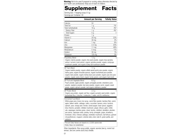 Each Serving Size (1 heaping scoop) (13 g) contains: Calories 50, Total Fat 1 g, Total Carbohydrate 10 g, Dietary Fiber 1 g, Total Sugars 5 g, Protein 1 g, Vitamin C 20 mg, Calcium 30 mg, Iron 1 mg, Zinc 2.2 mg, Manganese 1.1 mg, Molybdenum 5 mcg, Sodium 30 mg, Potassium 120 mg. Proprietary Blend 1.2 g: Organic matcha powder, organic chia seed powder, organic blue spirulina extract, turmeric (root) extract, organic spirulina powder, organic cordyceps mushroom powder, and organic turkey tail mushroom powder. SP Farm Blend 1.1 g: Organic kalette powder, organic alfalfa (aerial parts) juice powder, organic barley grass, organic Brussels sprouts, organic buckwheat juice powder, organic kale powder, organic kidney bean juice powder, organic pea vine juice powder, organic swiss chard, organic turnip greens, and organic beet (root). SP Fruit and Vegetable Blend 6.5 g: Peach powder, apple powder, organic pineapple powder, strawberry juice powder, raspberry powder, kiwi juice powder, organic carrot, organic sweet potato, organic spinach powder, and organic elderberry powder. SP Protein Blend 2.2 g: Organic pea protein, organic oat flour, organic pumpkin seed protein, organic buckwheat flour, L-leucine, L-isoleucine, L-valine, and DL-methionine. Fermented Food Blend 0.5 g: White grape juice, brown rice syrup, carrot fiber powder, bamboo fiber, carrot, apple, daikon radish, cabbage, celery, cucumber, banana, onion, burdock, spinach, pear, orange peel, tomato, sweet pepper, bean sprout, eggplant, lotus rhizome, pumpkin, shiitake mushroom, ginger, lettuce, garlic, trefoil, udo, asparagus, bamboo grass, clover, kombu, coltsfoot, dandelion, plantain, pea sprout, Japanese cedar, parsley, turnip, pineapple, grape, strawberry, knotweed, chive, Chinese cabbage, enokitake mushroom, leaf lettuce, garland chrysanthemum, mugwort, oriental celery, leek, todo fir, green perilla, and wakame. Other Ingredients: Rice syrup solids, organic acerola (berry), monk fruit extract, and zinc amino acid (rice) chelate.