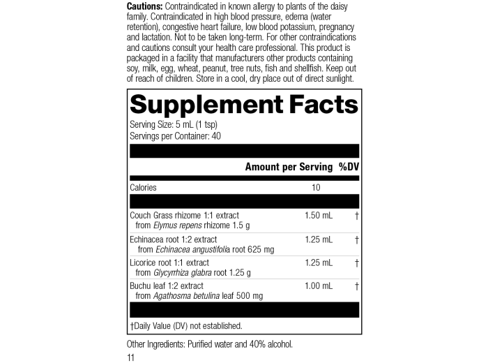 Each Serving Size 5 mL (1 tsp) contains: Calories 10, Couch Grass rhizome 1:1 extract 1.50 mL (from Elymus repens rhizome 1.5 g), Echinacea root 1:2 extract 1.25 mL (from Echinacea angustifolia root 625 mg), Licorice root 1:1 extract 1.25 mL (from Glycyrrhiza glabra root 1.25 g), Buchu leaf 1:2 extract 1.00 mL (from Agathosma betulina leaf 500 mg). Other Ingredients: Purified water and 40% alcohol.